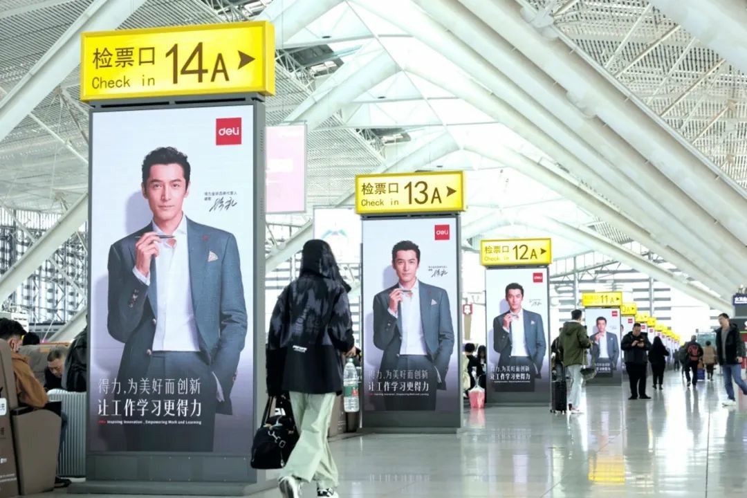同时,兆讯依据科学的媒体布局,以矩阵式刷屏为得力打造“沉浸式”品牌传播空间,多城联动,同频共振。精美的高清刷屏画面中,“国民男神”胡歌气质尽显,不禁吸引往来旅客驻足观看,通过一次次的近距离对话,不断强化得力品牌印象,完成B、C端诉求的有效传递——得力步履不停,“让工作学习更得力”。