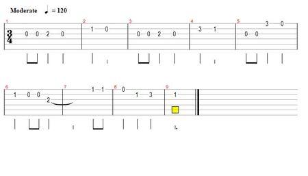 六線譜中的數(shù)字1、0、3、13(重疊)表示吉他的品格,寫在線上的數(shù)字則表示左手按第幾品,數(shù)字所在的線就是右手要彈的弦,(特別注意譜中的0,則表示空弦只彈不按,左手不按右手彈第一弦)